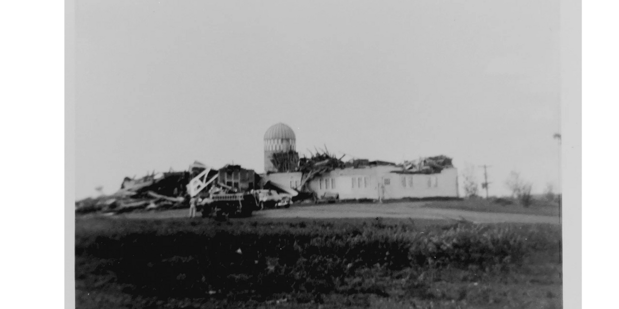 “At the end of May 1958, the storm clouds rolled in around 3pm and within seconds funnel clouds started to form. The first touchdowns of the storm occurred near White Bear Lake then on into the Dellwood area where it ripped through the Norman Slade farm. Traveling in a Southeasterly direction, the twister took out power lines, trees, farm buildings and more. The tornado continued on its path of destruction as it swooped into the Lake Elmo area and took out the large barn on the Cloverdale Farm.